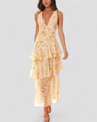 Float effortlessly from brunch to beach wedding in this romantic ruffle-tiered maxi dress. The deep V-neckline and open back with delicate cross-tie detail give this dress a bold, feminine edge, while the cascading layers bring movement and drama. Crafted in a breezy, lightweight chiffon, it offers the perfect blend of softness and structure. Whether you're barefoot on a coastal terrace or styled up with heels for evening glamour, this piece is your ticket to a sun-drenched statement look.