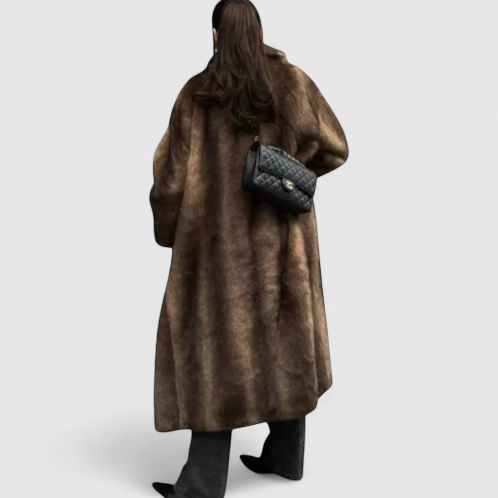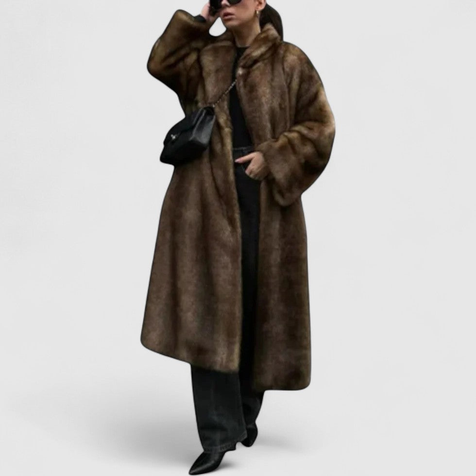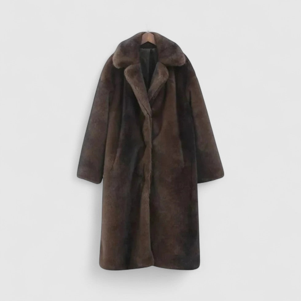 A timeless faux fur overcoat designed to keep you warm during colder days. The long sleeves and classic cut provide a chic layered look for winter outfits. Soft to the touch and comfortable for both casual and dressy occasions.