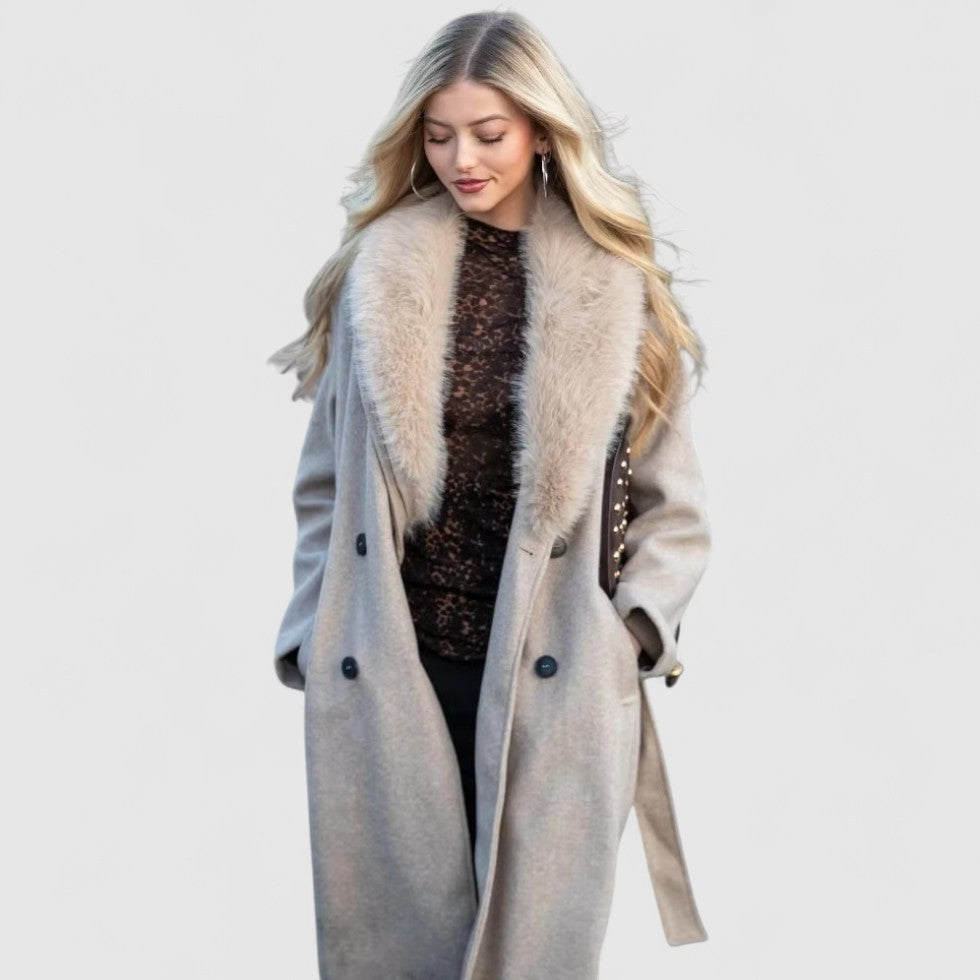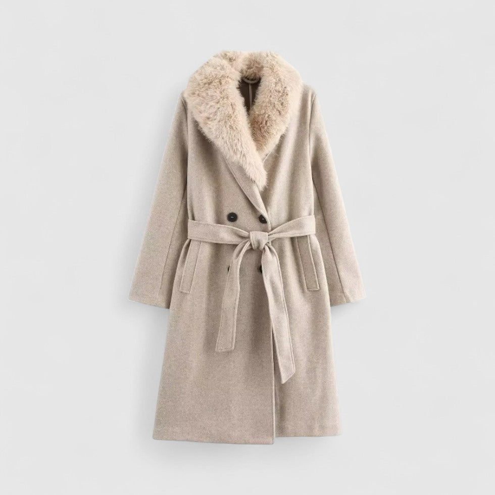 This long faux fur winter overcoat offers a cosy, layered look designed for colder weather. The double-breasted closure and classic lapel detail give it a timeless style that works well for both day and evening wear. Its belted waist and welt pockets add practicality while maintaining a refined silhouette.