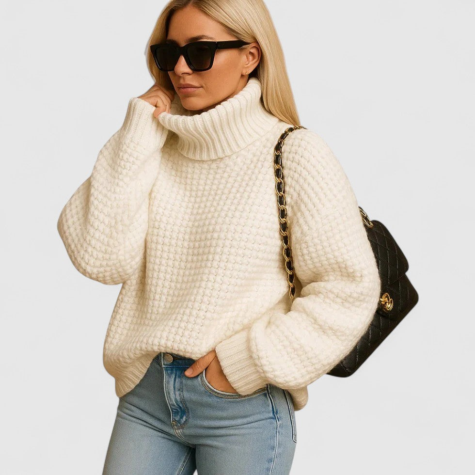 A cosy knitted sweater designed to keep you comfortable during chilly days. Featuring a high turtleneck and a soft textured knit, it’s ideal for layering with your favourite winter outfits. Its relaxed fit offers warmth and style for everyday wear.